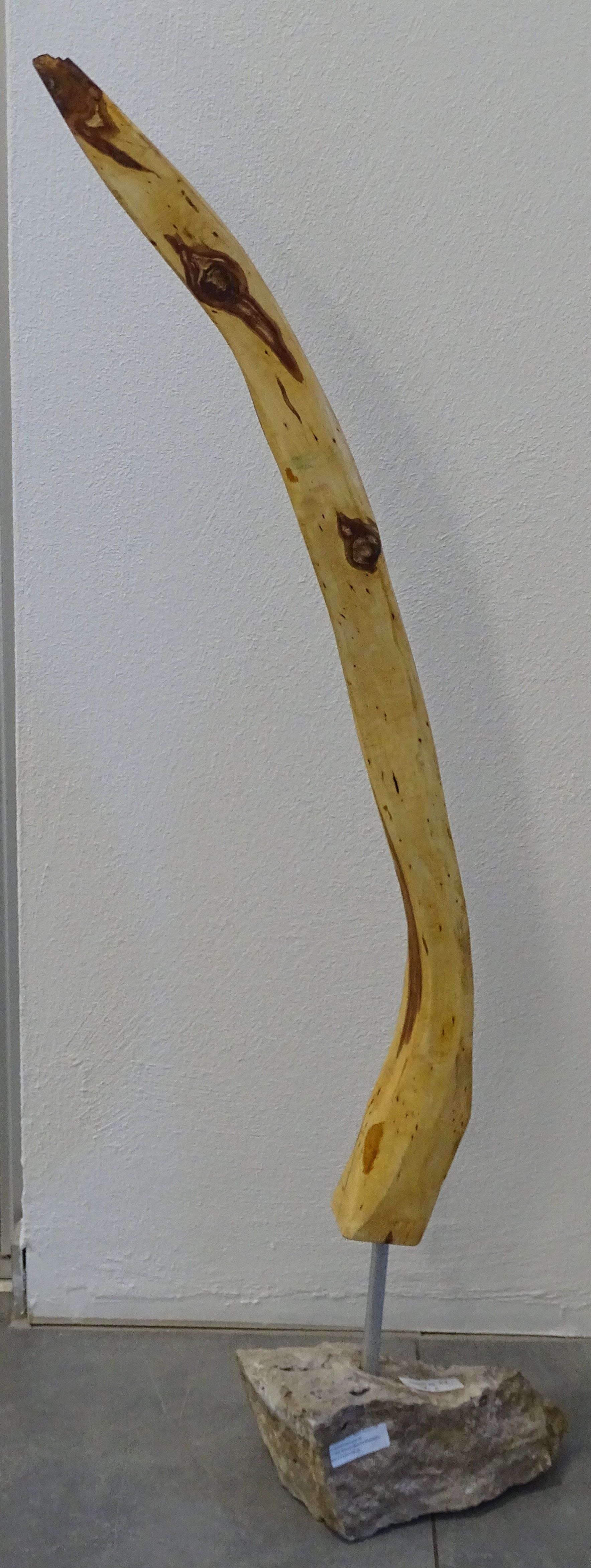 Naturstein, Stahlplatte, alte Holzdiele, Leichtbetonstein, Granitstein, Steinplatten, Obstbaumholz, Metallstab für die Befestigung in der Erde.