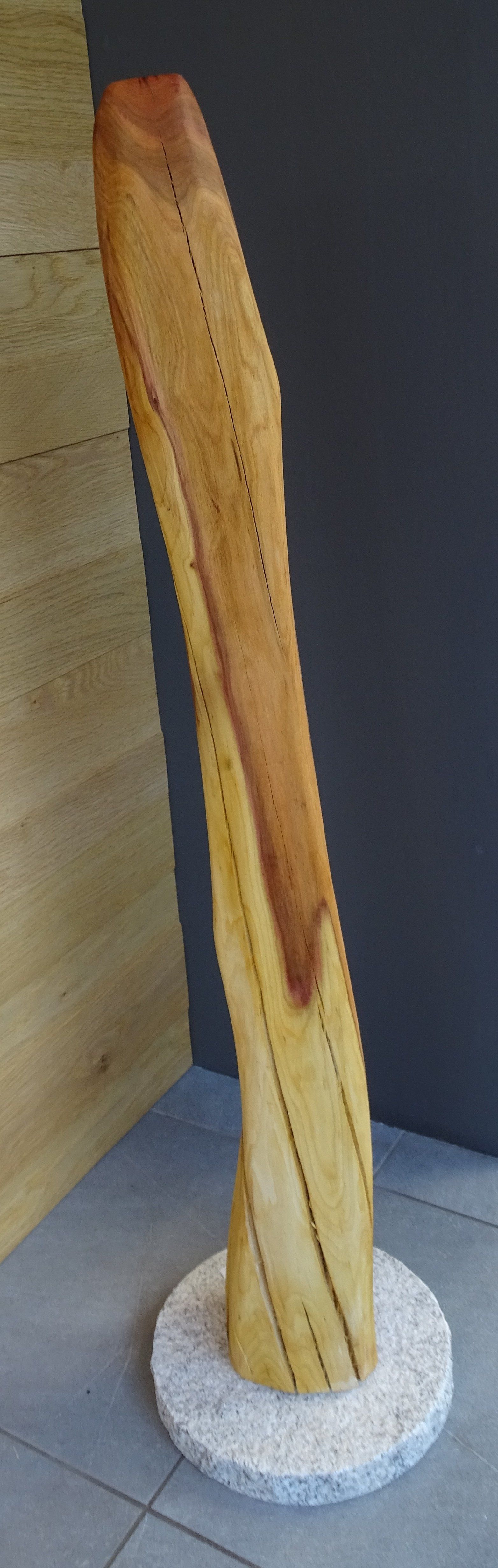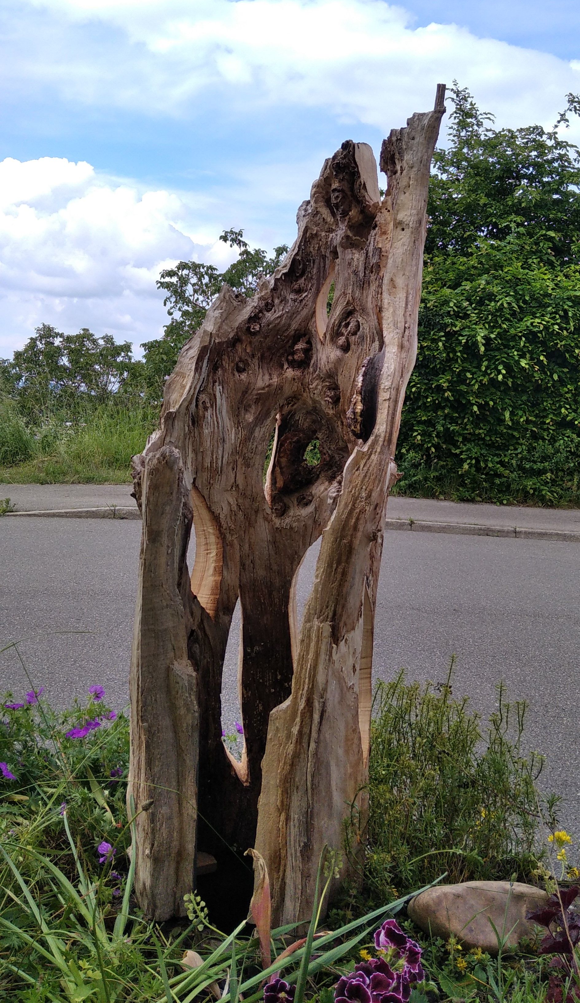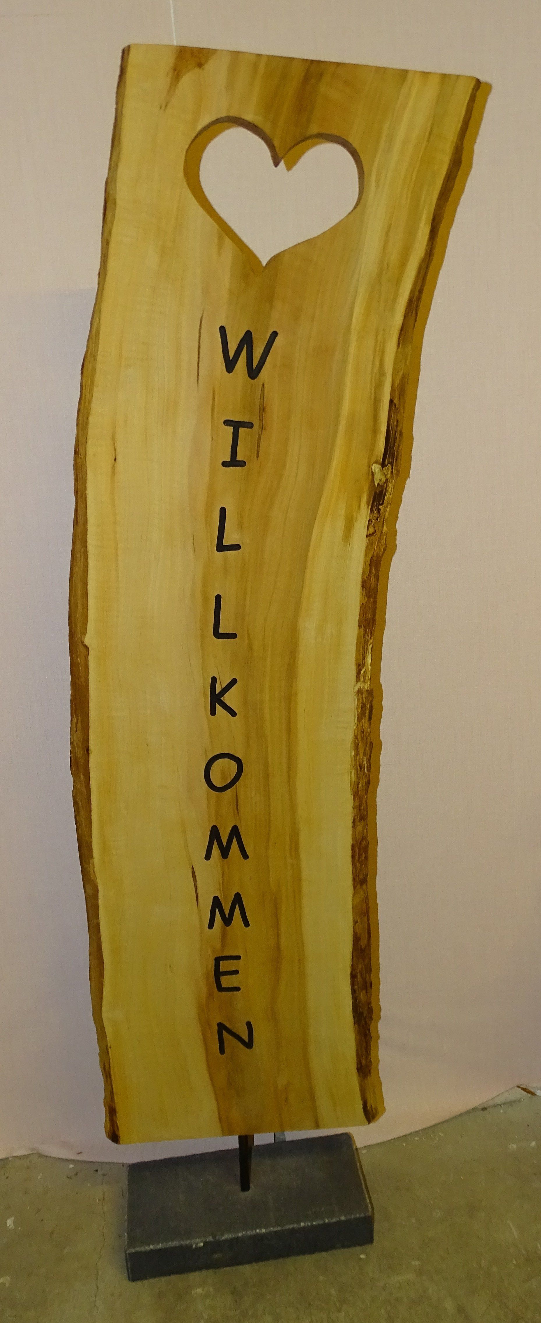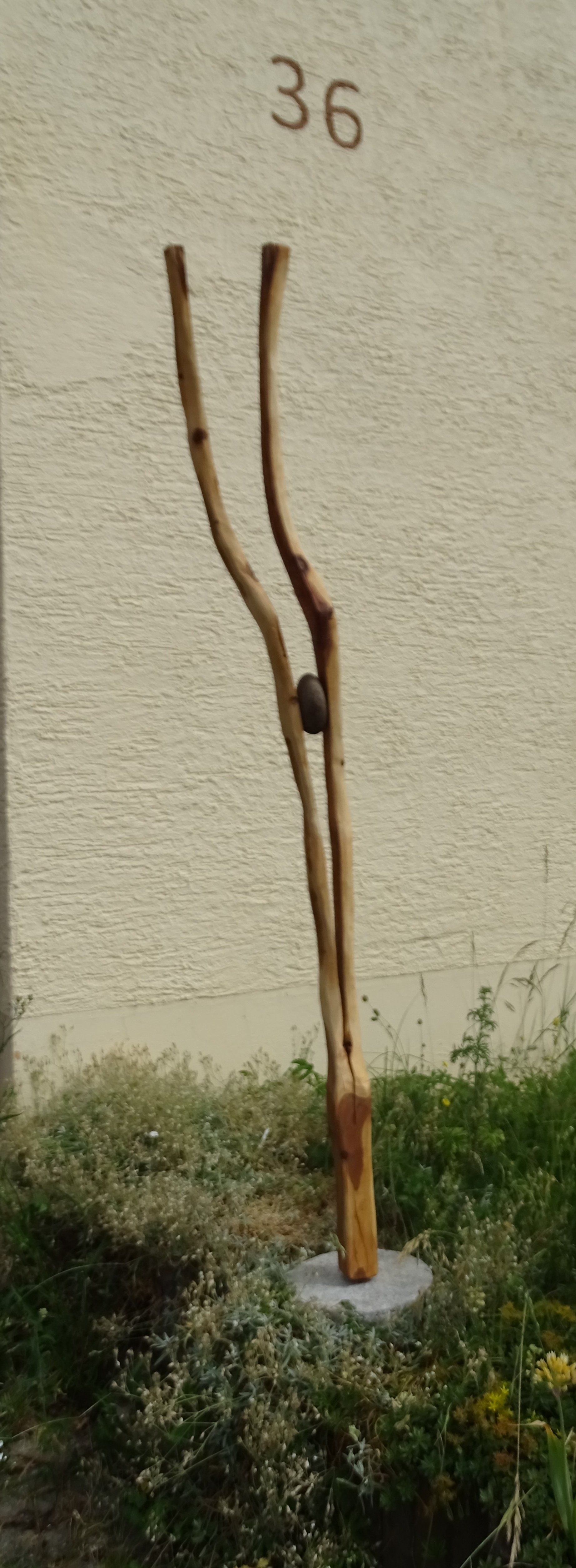 Naturstein, Stahlplatte, alte Holzdiele, Leichtbetonstein, Granitstein, Steinplatten, Obstbaumholz, Metallstab für die Befestigung in der Erde.