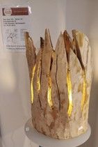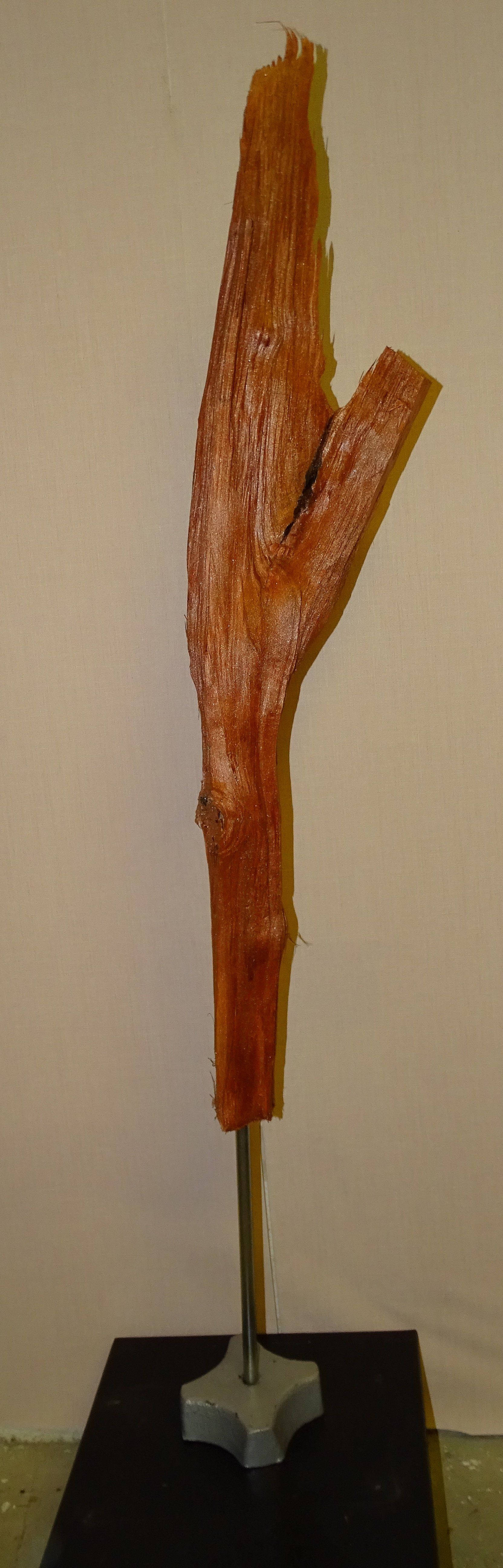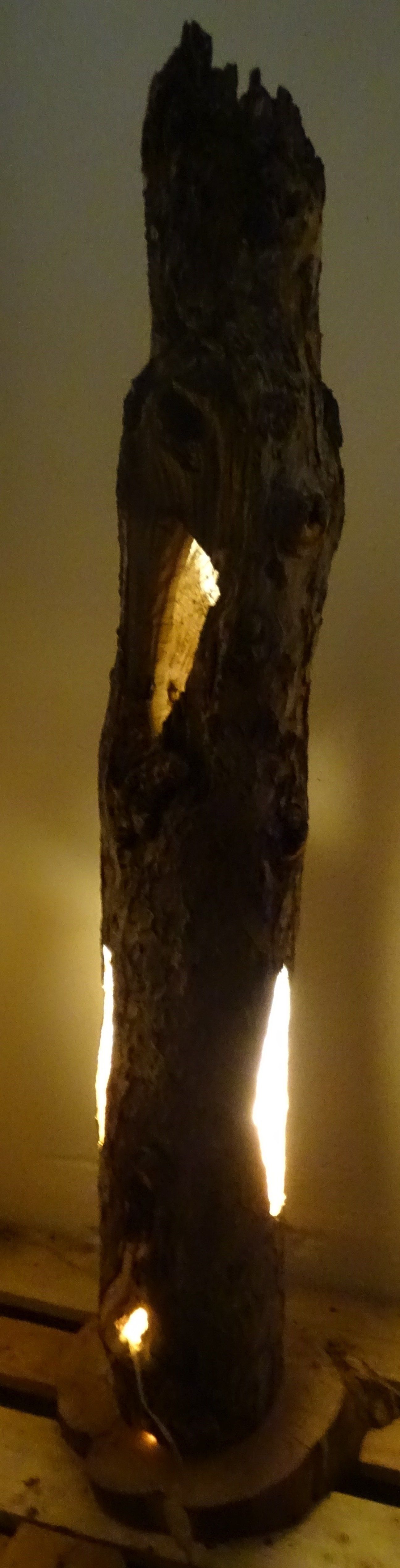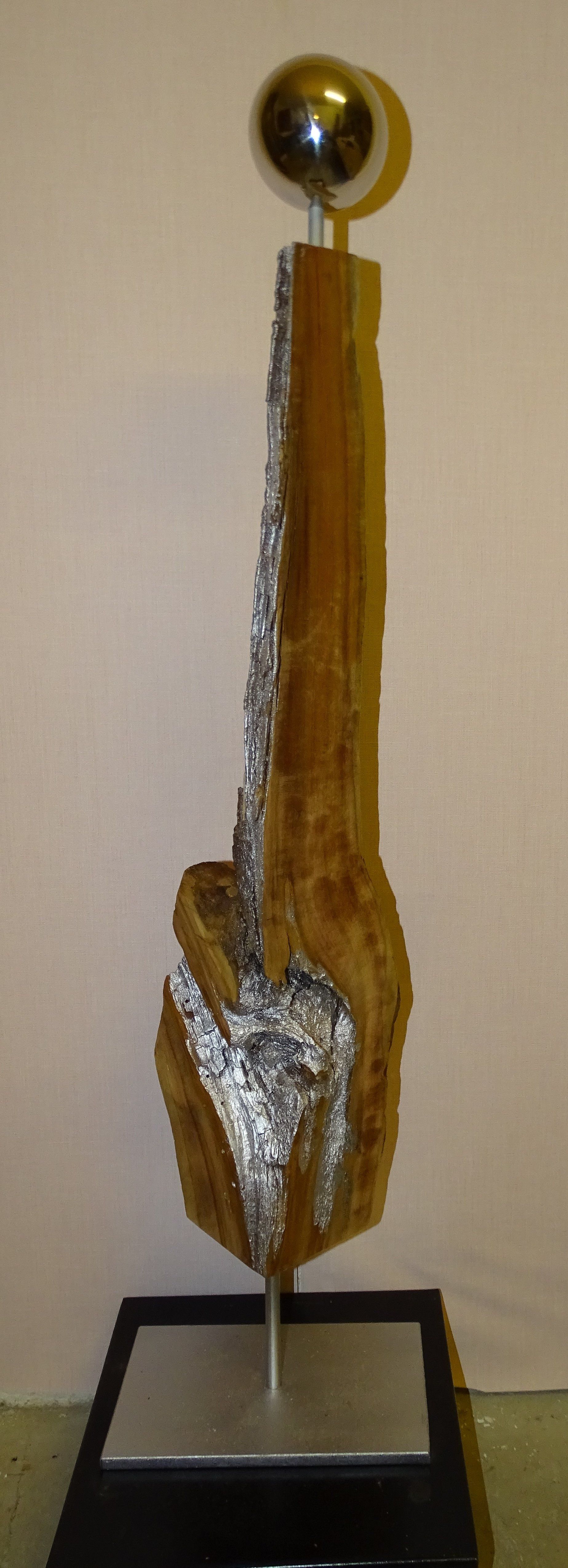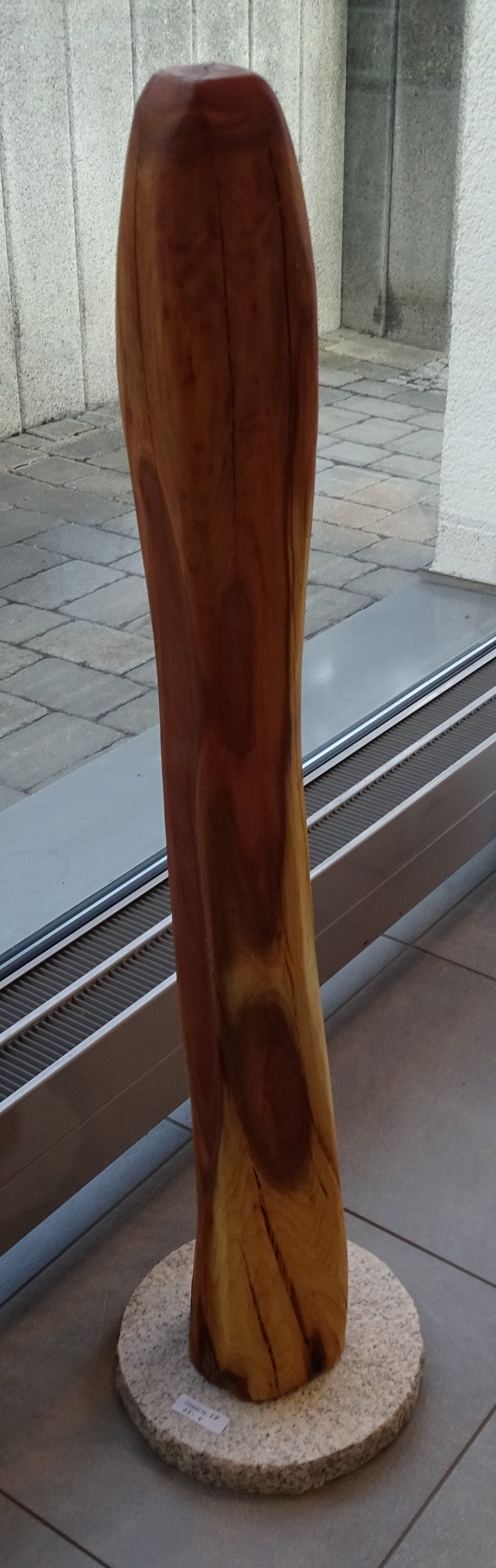 Naturstein, Stahlplatte, alte Holzdiele, Leichtbetonstein, Granitstein, Steinplatten, Obstbaumholz, Metallstab für die Befestigung in der Erde.